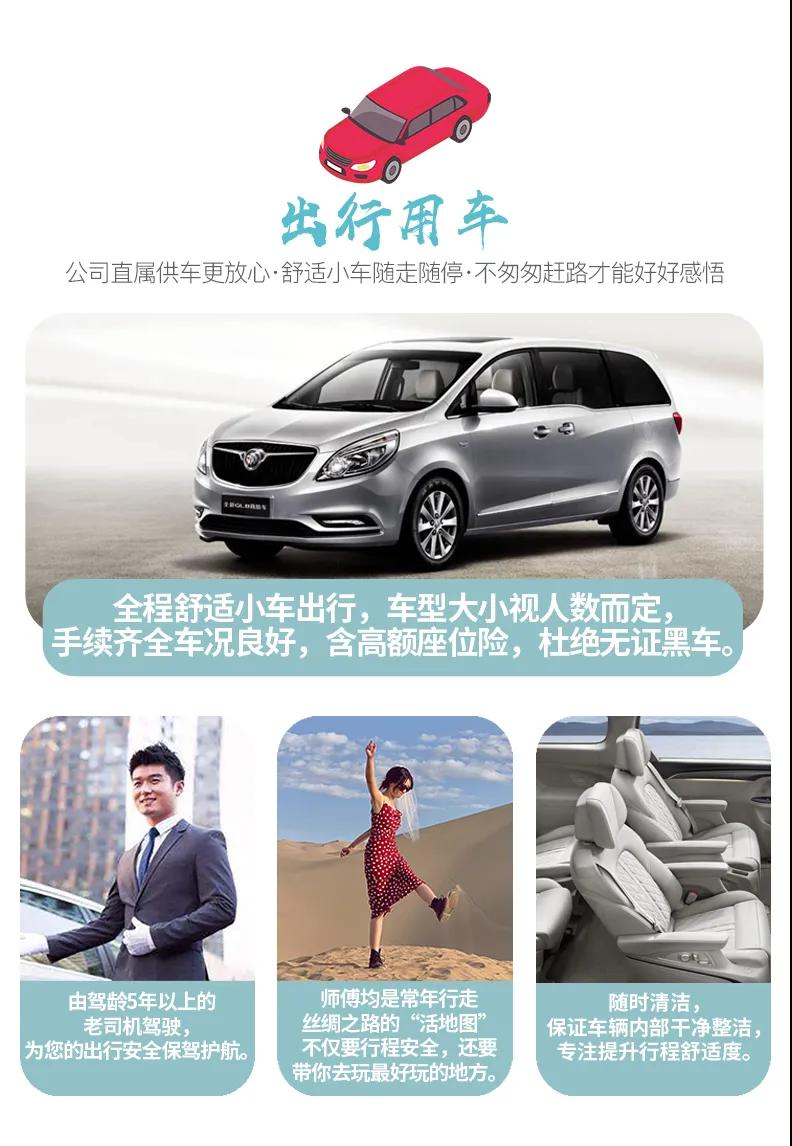 VIP私享6人小團,全程商務(wù)車出行,保證一人一正座位,車型大小根據(jù)實際人數(shù)安排,且由駕駛經(jīng)驗豐富的司機為您的出行保駕護航,報價包含車費、油費、停車費、維修費及司機勞務(wù)費。