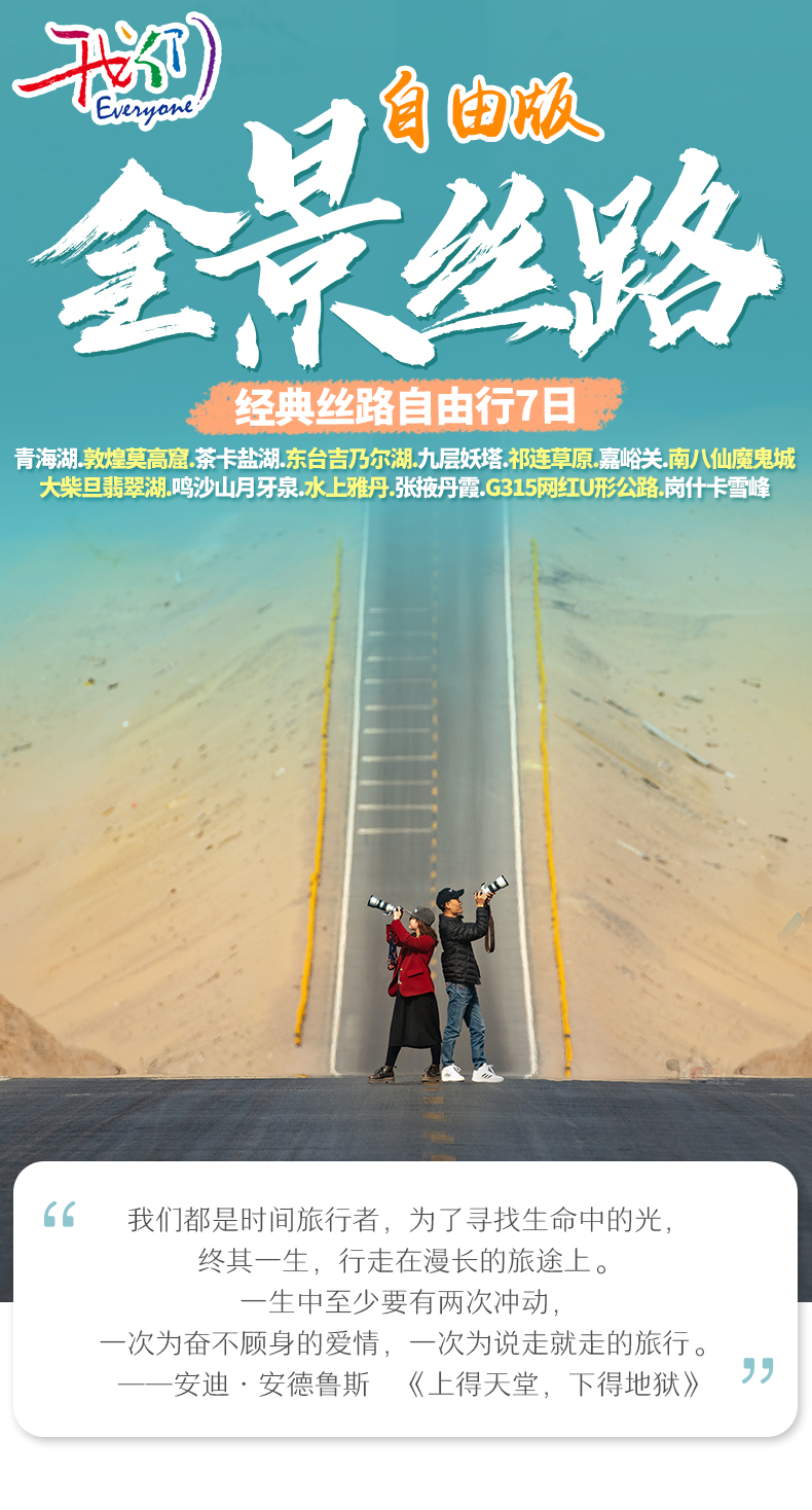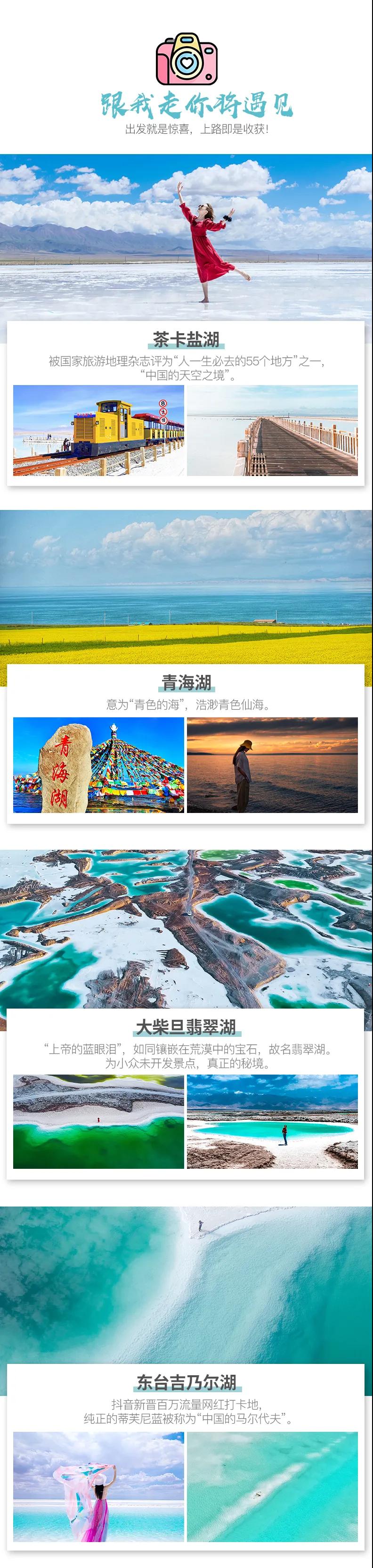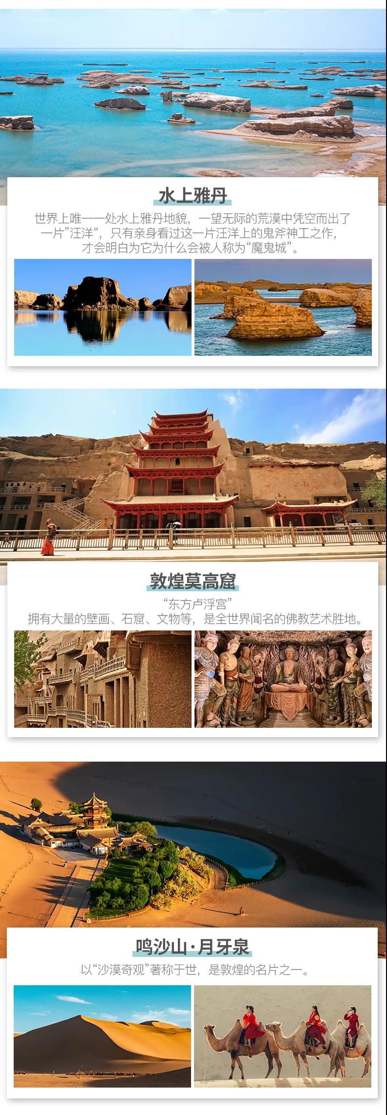 青海湖+敦煌莫高窟+茶卡鹽湖+東臺吉乃爾湖+九層妖塔+祁連草原+嘉峪關(guān)+南八仙魔鬼城+大柴旦翡翠湖+鳴沙山月牙泉+水上雅丹+張掖丹霞+G315U形公路+崗什卡雪峰