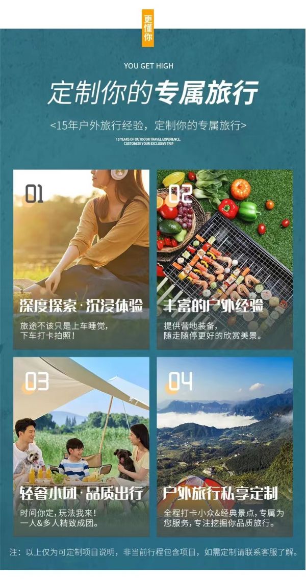 私人訂制:我們業(yè)務范圍囊括了全國各大城市,川西、西北、西藏、新疆,在路上永遠有我們的身影。我們將為每一個有定制需求的你策劃出獨屬于自己的完美旅行。