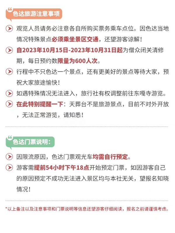 請對應使用我方色達2-6人VIP自由小團5日行程,因使用其它行程造成的投訴,責任自負;請仔細閱讀以上行程文檔,同意并保證遵守我方安排,以免為您帶來不必要的麻煩;如產(chǎn)生合同糾紛或人身意外事故,按《中華人民共和國合同法》、《道路交通法》、《保險賠償條例》裁定;本行程作為旅游合同附頁與旅游合同同等法律效力。