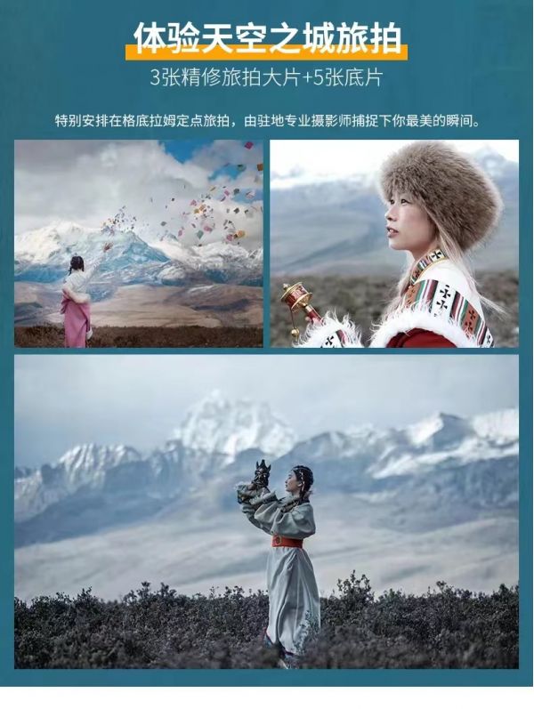 5、贈送體驗天空之城-格底拉姆定點旅拍(3張精修旅拍大片+5張底片)*因冬季冰雪的特殊原因,以無法前往格底拉姆,屆時我們將安排您前往新都橋參加營地旅拍。