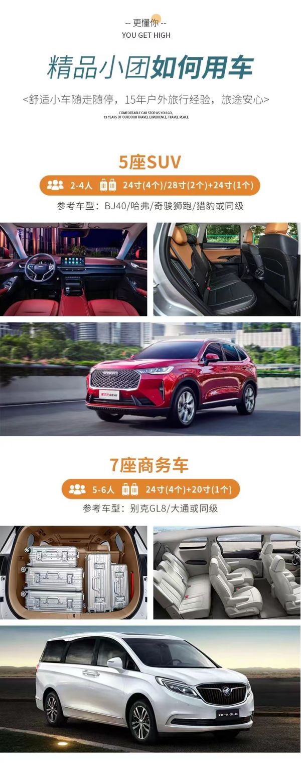 交通:2-8人VIP私享小團全程舒適SUV/商務車出行;車型大小根據(jù)實際人數(shù)安排,且由駕駛經(jīng)驗豐富的司機為您的出行保駕護航,報價包含車費、油費、停車費、維修費及司機勞務費。