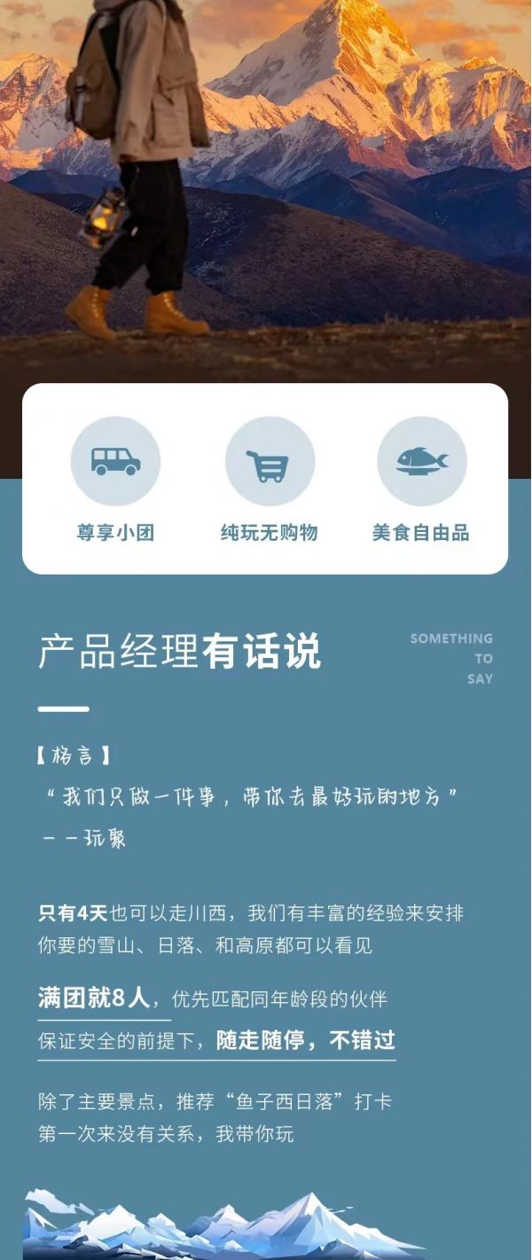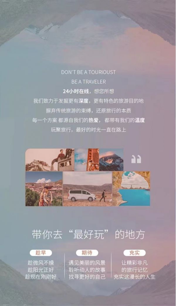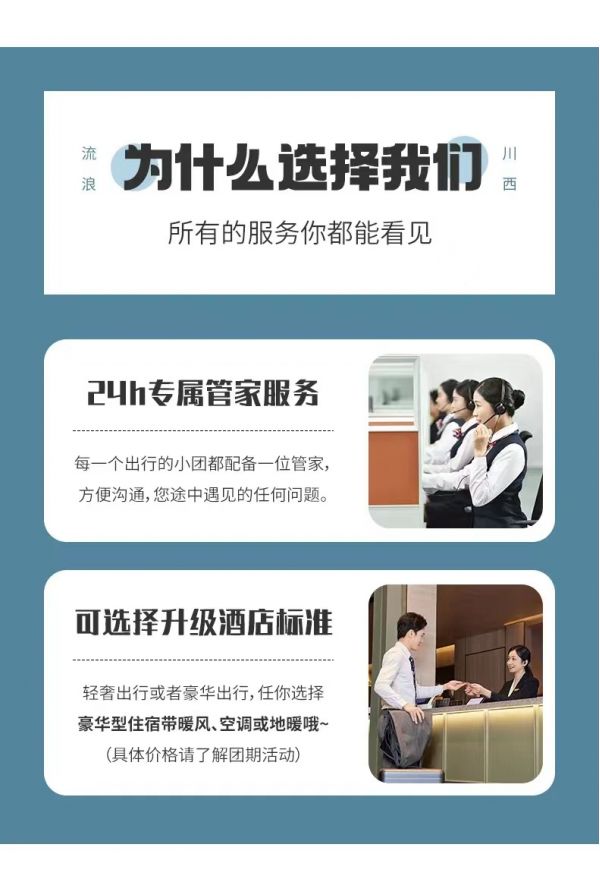 私人訂制:我們業(yè)務(wù)范圍囊括了全國各大城市,川西、西北、新疆、西藏,在路上永遠(yuǎn)有我們的身影。我們將為每一個(gè)有定制需求的你策劃出獨(dú)屬于自己的完美旅行。