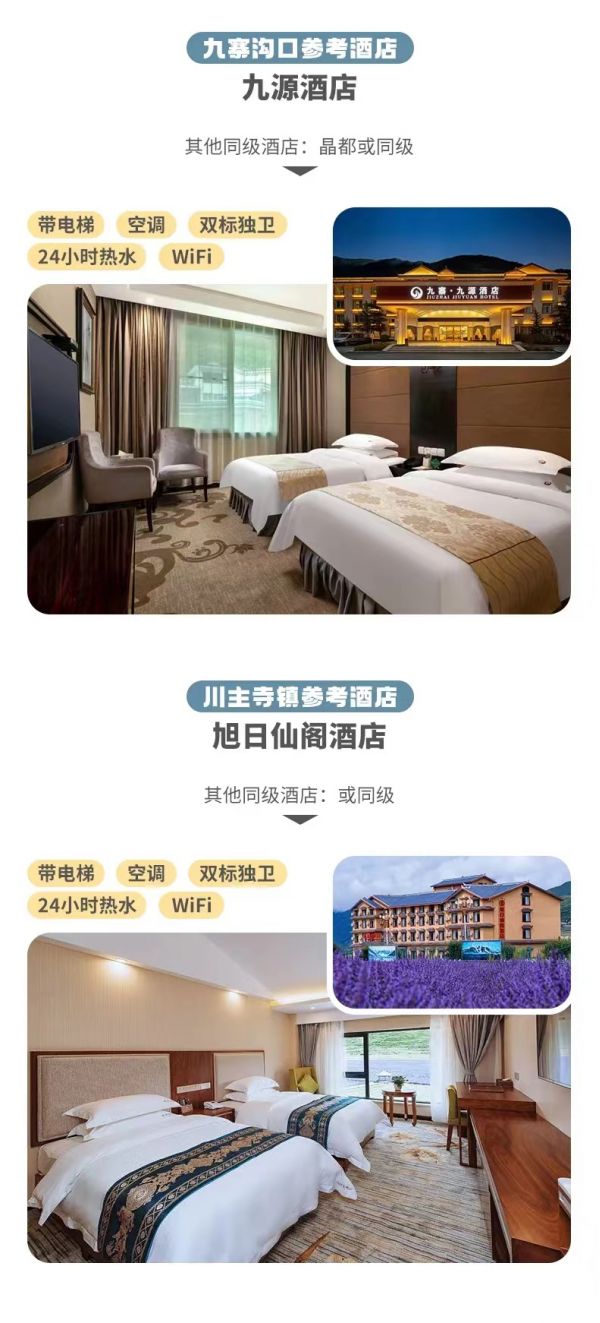 今天,早餐后由司機(jī)驅(qū)車統(tǒng)一帶領(lǐng)游客【九寨溝景區(qū)】門口。令人魂?duì)繅?mèng)繞的九寨溝將為你揭開美麗動(dòng)人的神秘面紗。(九寨溝為自然風(fēng)景游覽勝地,以拍照參觀為主,游覽時(shí)間7-9 小時(shí));翠海瀲滟,天水相接;瀑布生煙,氣勢磅礴;彩林絢麗,千姿百態(tài),雪山巍峨,銀峰玉柱。珍珠灘,飛珠濺玉;五花海,流光溢彩;長海,靜穆幽深......移步換景,令人目不暇接,群山如畫,綠水如詩,詩情畫意,韻味無窮。 游覽結(jié)束后前往九寨溝溝口酒店入住休息(或根據(jù)當(dāng)日車況等情況,看需不需要調(diào)整到川主寺鎮(zhèn)入住)。