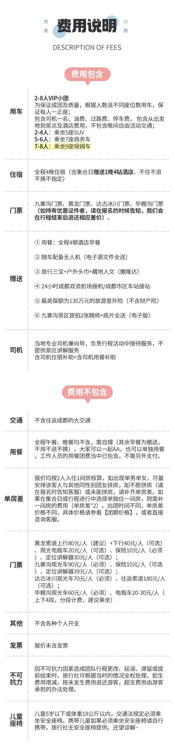 (1)受天氣、堵車等客觀因素影響,當(dāng)日回成都比較晚,請(qǐng)盡量不預(yù)訂當(dāng)天的返程機(jī)票或火車票,以免因?yàn)槎萝嚱o您帶來沒有必要的損失。
