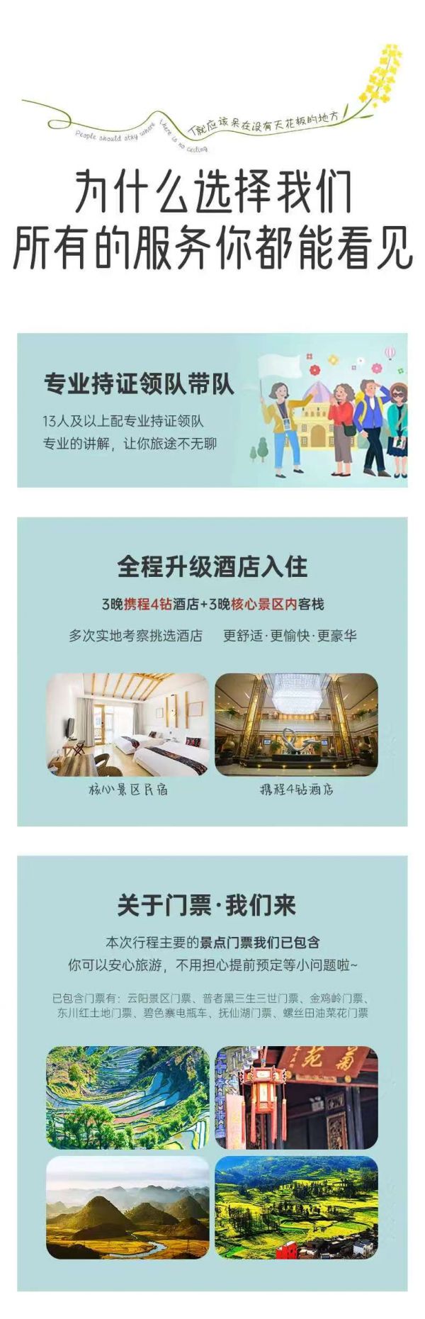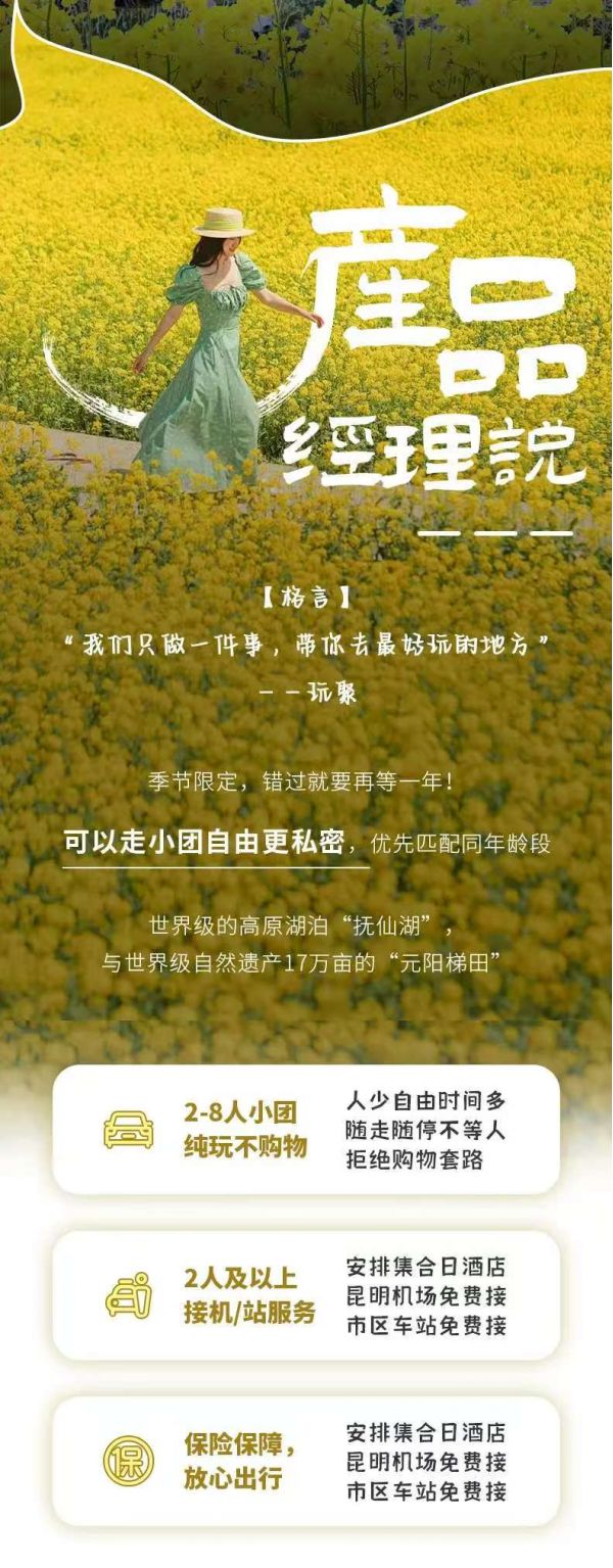 包含元陽景區(qū)門票(元陽現(xiàn)實(shí)行單點(diǎn)單獨(dú)檢票制,我們購買為單次門票,不能重復(fù)進(jìn)入景區(qū),如果希望多次進(jìn)入需另自費(fèi)購門票)、普者黑三生三世景區(qū)門票、金雞嶺門票、蒙自電瓶車費(fèi)、撫仙湖門票、螺絲田油菜花時(shí)節(jié)性門票。