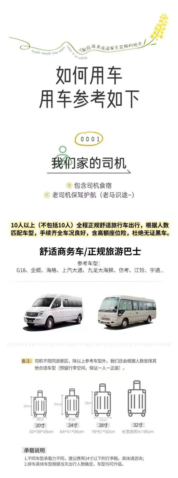 為保證成團(tuán)及質(zhì)量,根據(jù)人數(shù)派不同座位數(shù)用車,保證每人一正座;