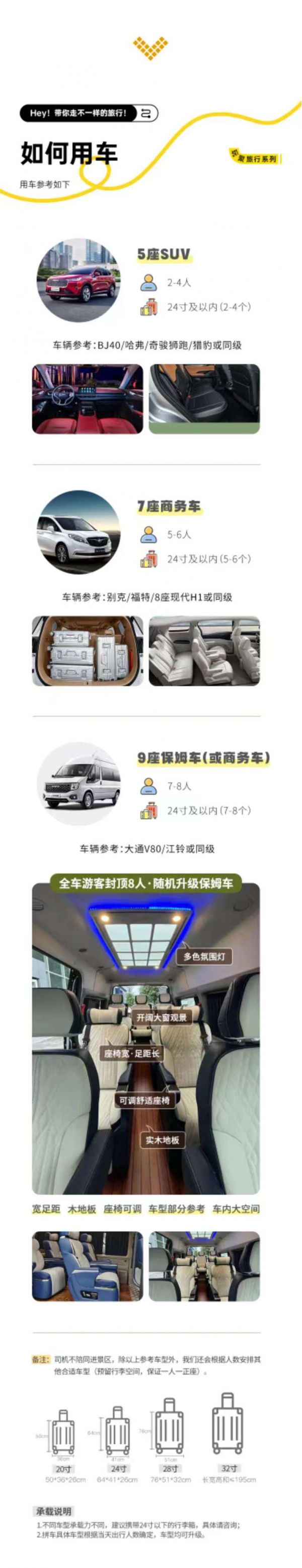 為保證成團及質量,根據人數派不同座位數用車,保證每人一正座;