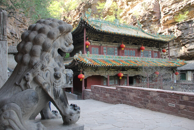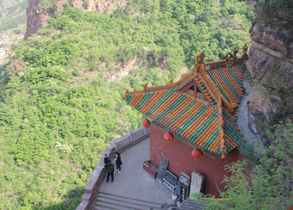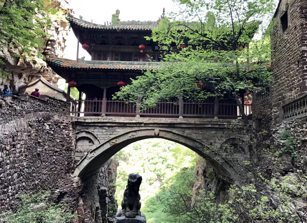 一絕“橋樓殿”。橋凌駕于百仞峭壁之間,仰視藍(lán)天一線(xiàn),俯首萬(wàn)丈深淵。形制如同趙州橋敞肩拱式。橋上建樓,云飛樓動(dòng),樓內(nèi)建殿,殿內(nèi)三尊大佛。真是“千丈虹橋望入微,天光云彩共樓飛”,不是仙境勝似仙境,疑是天堂落塵埃。現(xiàn)為中國(guó)三大懸空寺之一。