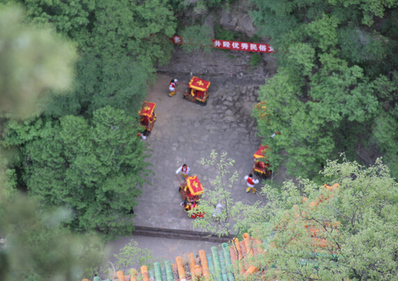 演駕隊(duì)伍浩浩蕩蕩,途經(jīng)村莊皆?shī)A道相迎,鑾駕一到,路旁眾人就地跪拜,恭送過(guò)村。鑾駕到蒼巖山下胡家灘村口,又放三聲大炮,蒼巖山福慶寺內(nèi)眾僧徒恭候在山門(mén)口,簡(jiǎn)短的接駕儀式后,馬子頭前飛巖走壁,在蒼巖山一尺多寬的懸崖邊的圍墻上快跑三個(gè)來(lái)回,方才完成使命,最后再把鑾駕護(hù)送至山上的公主祠內(nèi)。