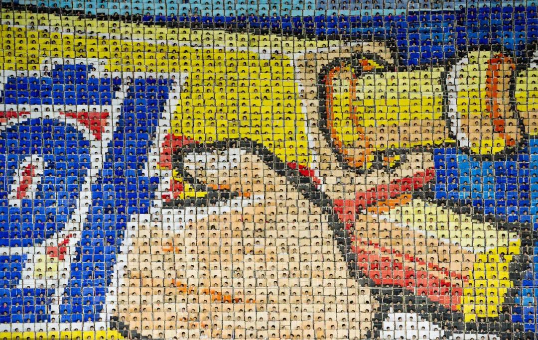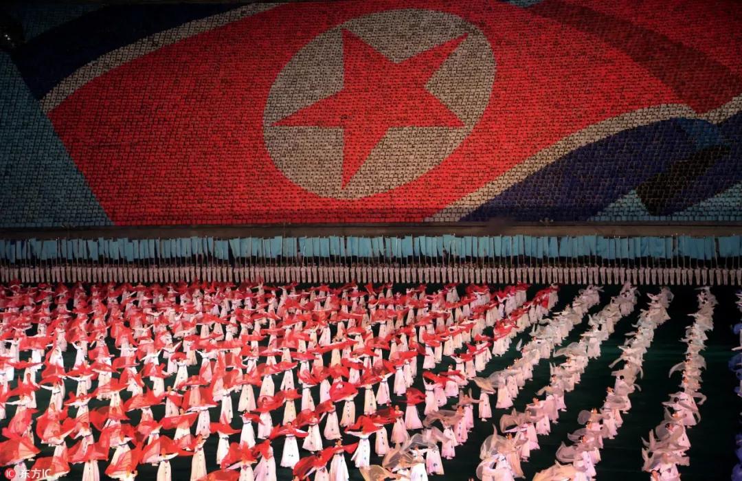 背景變換由朝鮮的小學(xué)生們手舉彩色翻板組成