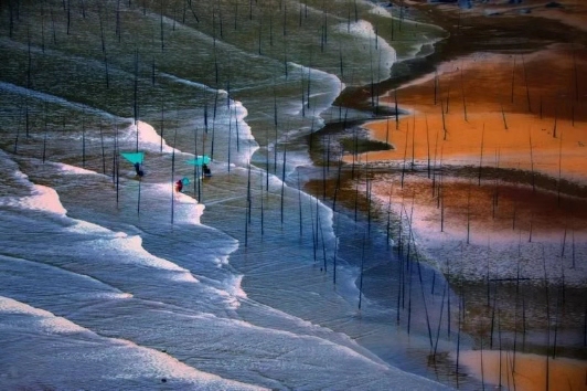 上午:北兜拍攝日出 紫菜場(chǎng)風(fēng)光,涵江風(fēng)光,這時(shí)候紫菜養(yǎng)殖場(chǎng),拉竹竿掛苗繩,海面船只穿梭,漁民勞作一派繁忙的景象,滿灘滿海都是竿影人影船影,畫面任你裁減,紫菜還會(huì)吸收不同光源;