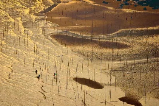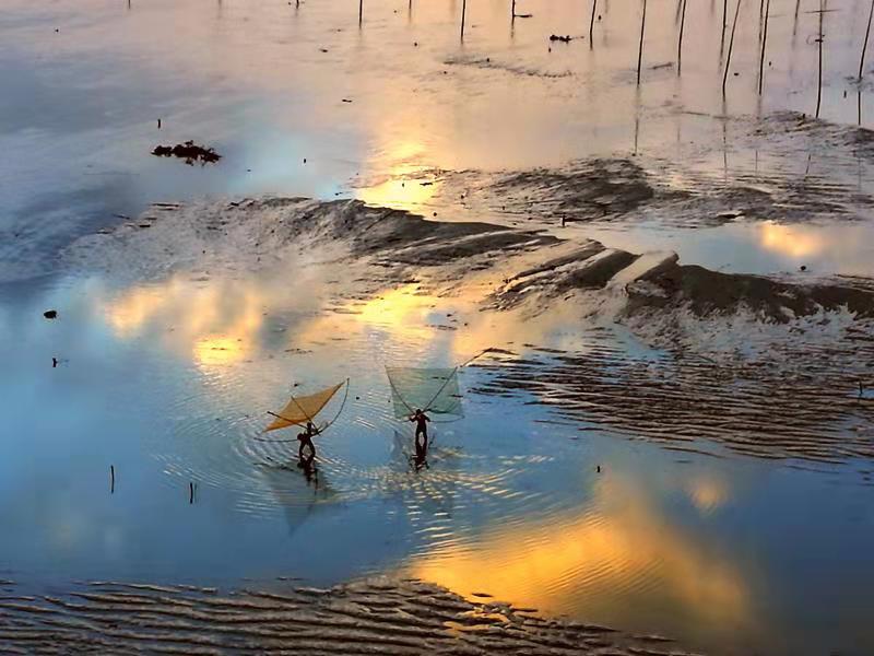下午:南灣灘涂甲骨文圍網(wǎng)迷宮夕陽(yáng)下、晨陽(yáng)中,仿佛海面鍍上了一層金黃,有小舟泛過(guò)。
