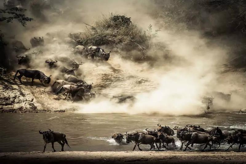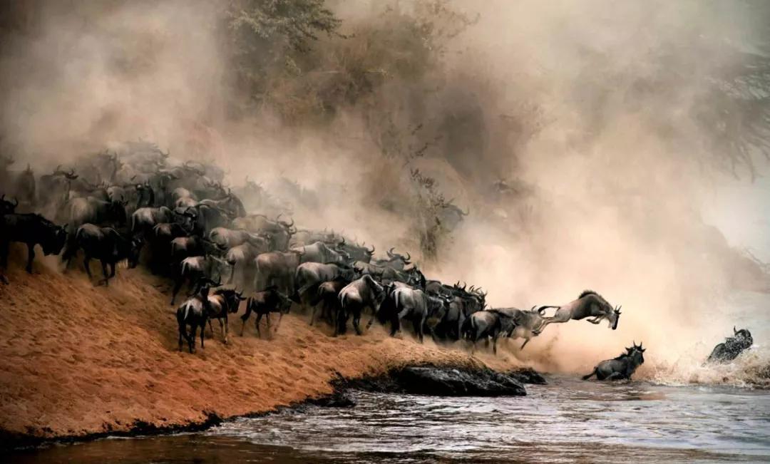 每年馬賽馬拉都會上演世界上最偉大的自然奇觀,那就是舉世聞名的動物大遷徙。從7月到10月,位于北方的馬賽馬拉因連綿的降雨而孕育出新鮮青草地,芬芳的青草氣味,將一百三十萬原居于南面塞倫蓋蒂的牛羚深深吸引,使之匯聚成為動物世界最大的一組移動群體,并且,無懼水里那兇猛的大鱷魚,前樸后繼的,前呼后擁的橫河跨境,進入新天地。他們越過邊坦肯邊境進入開闊的馬賽馬拉, 在廣袤的地平線上如浪潮般一波一波涌進來。如斯景象,也造就了獨步天下,舉世無雙的牛羚(角馬)大遷徙。