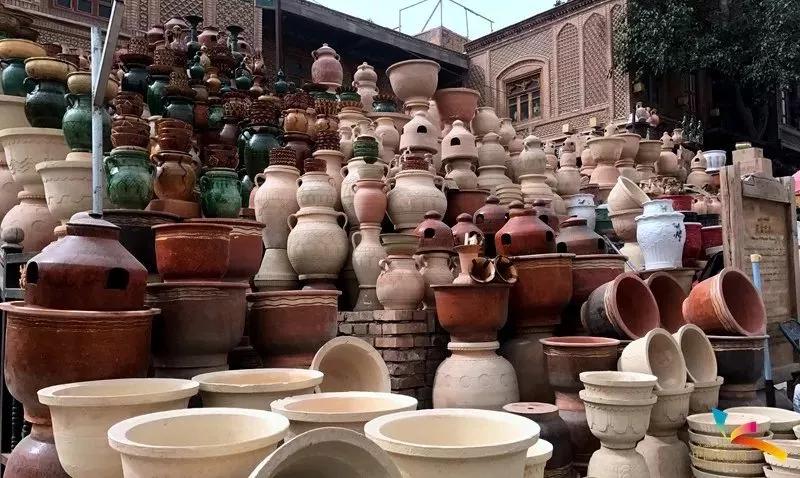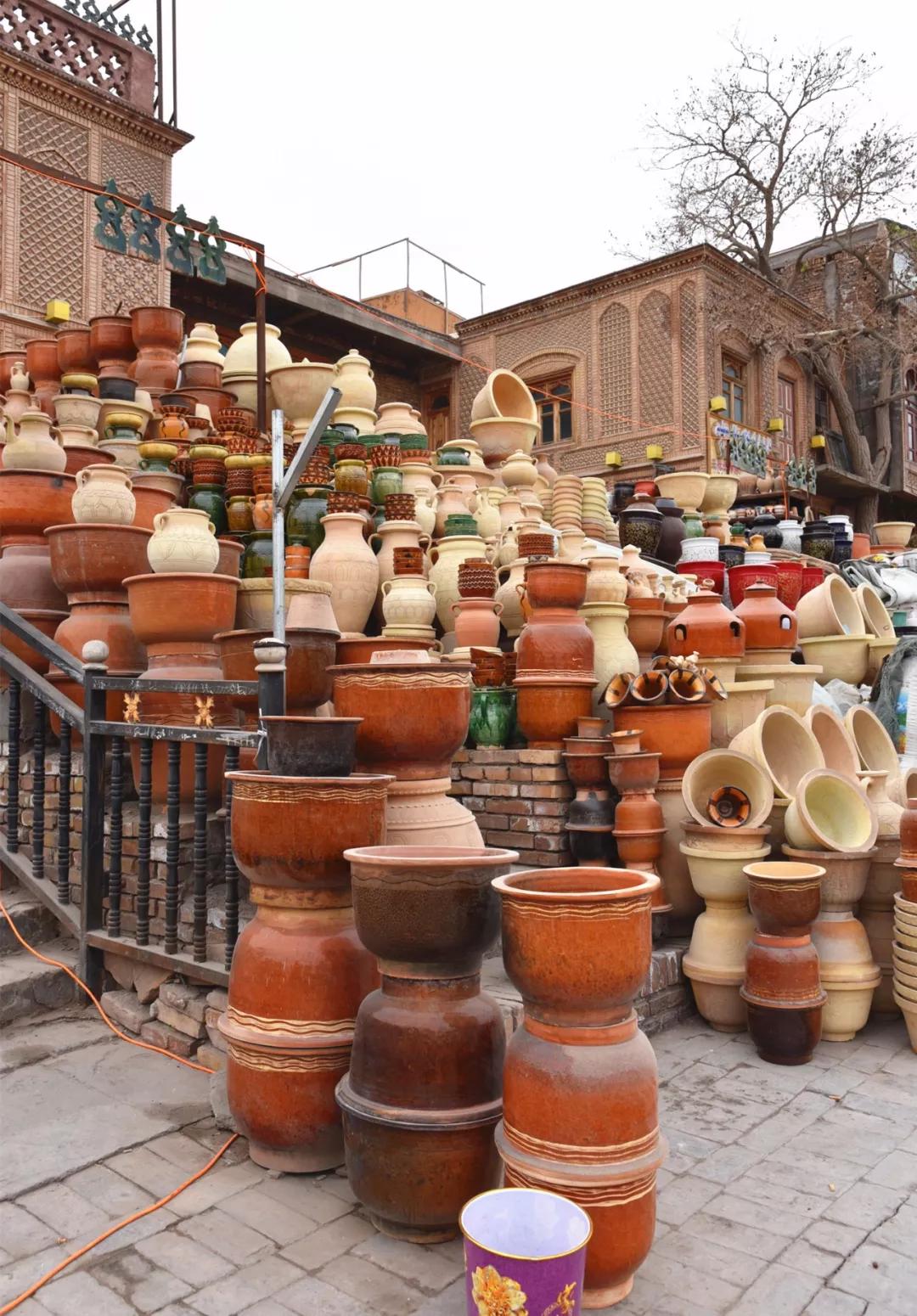 2、花盆巴扎喀什古城城門南側(cè),是花盆巴扎,巴扎入口處是彩陶墻,琳瑯滿目的陶器,讓人贊嘆不已。喀什土陶也被稱為“泥巴藝術(shù)”,器型主要以碗、碟、盤、壺等生活器具為主。(“巴扎”是維吾爾語,翻譯過來是集市的意思。)