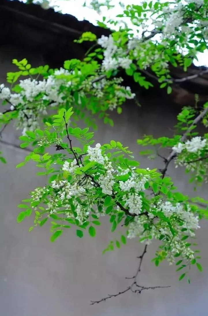 雪白的槐花和綠葉搖來(lái)?yè)u去香雪似海