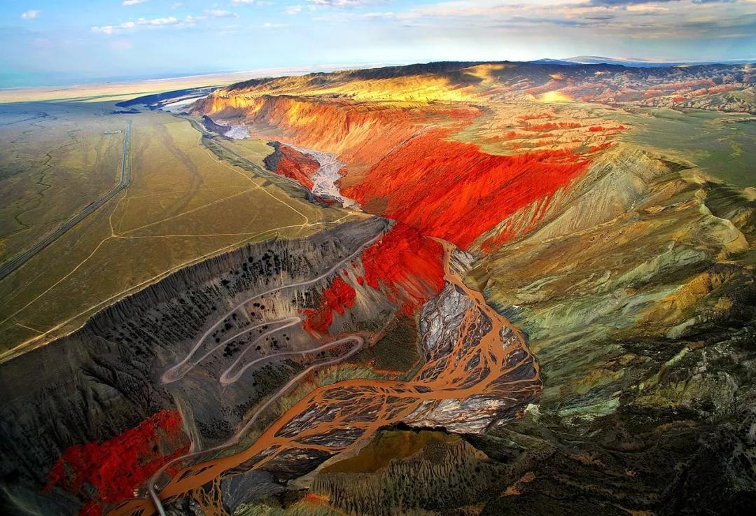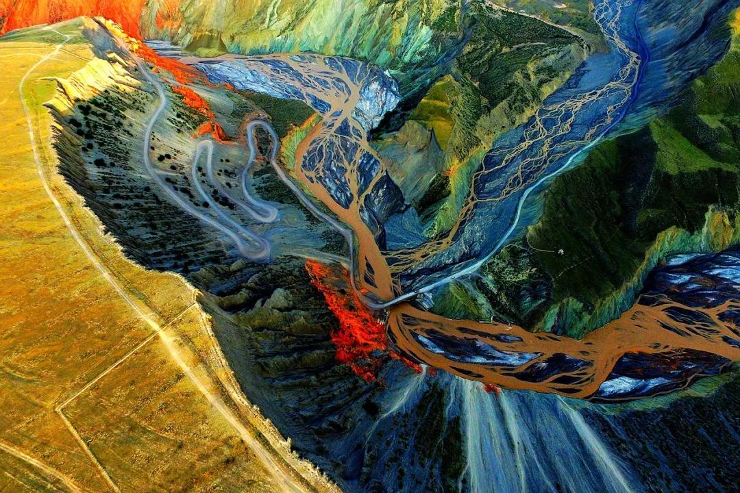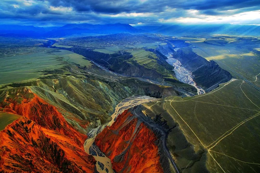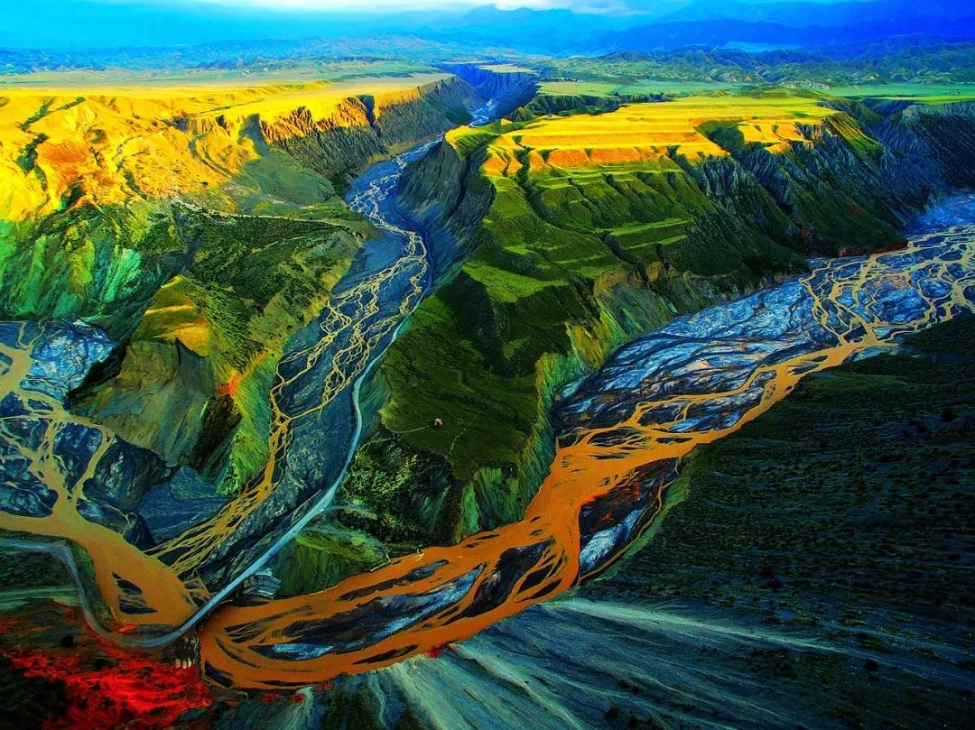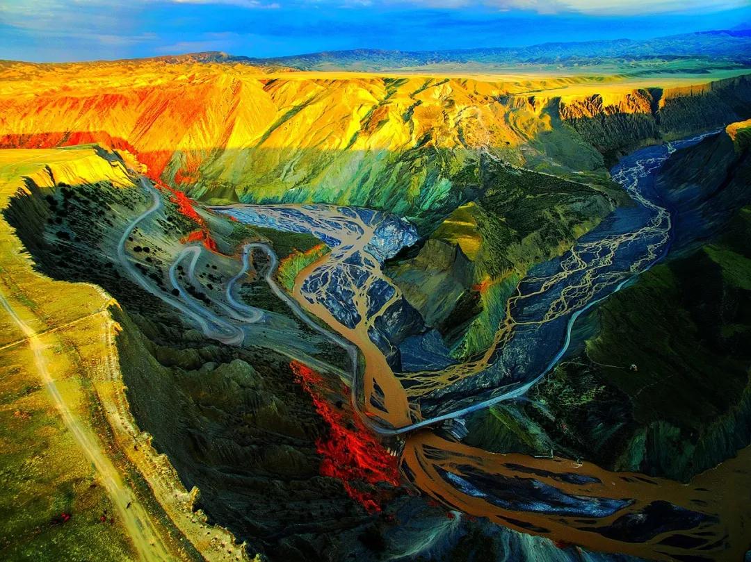 從高空看,安集海峽谷的色彩異常豐富,河流切割大地,將不同顏色的巖層沖刷溶解,形成了一幅絢麗多彩的大地抽象畫景觀。與其他一些色彩灰冷單調(diào)的峽谷相比,擁有紅山、黛崖、青峰、綠島、碧水等豐富色彩的安集海峽谷,就像一條彩帶飛舞在天山北坡腳下,成為中國(guó)峽谷群中一條色彩最豐富的大峽谷。