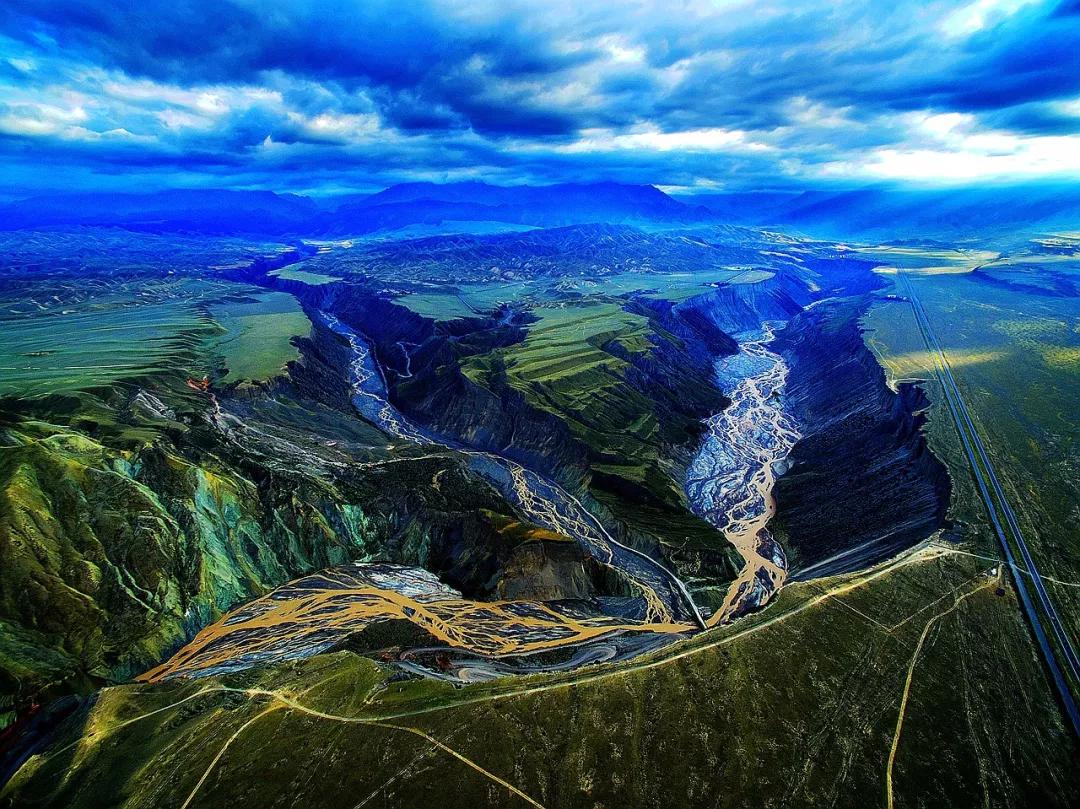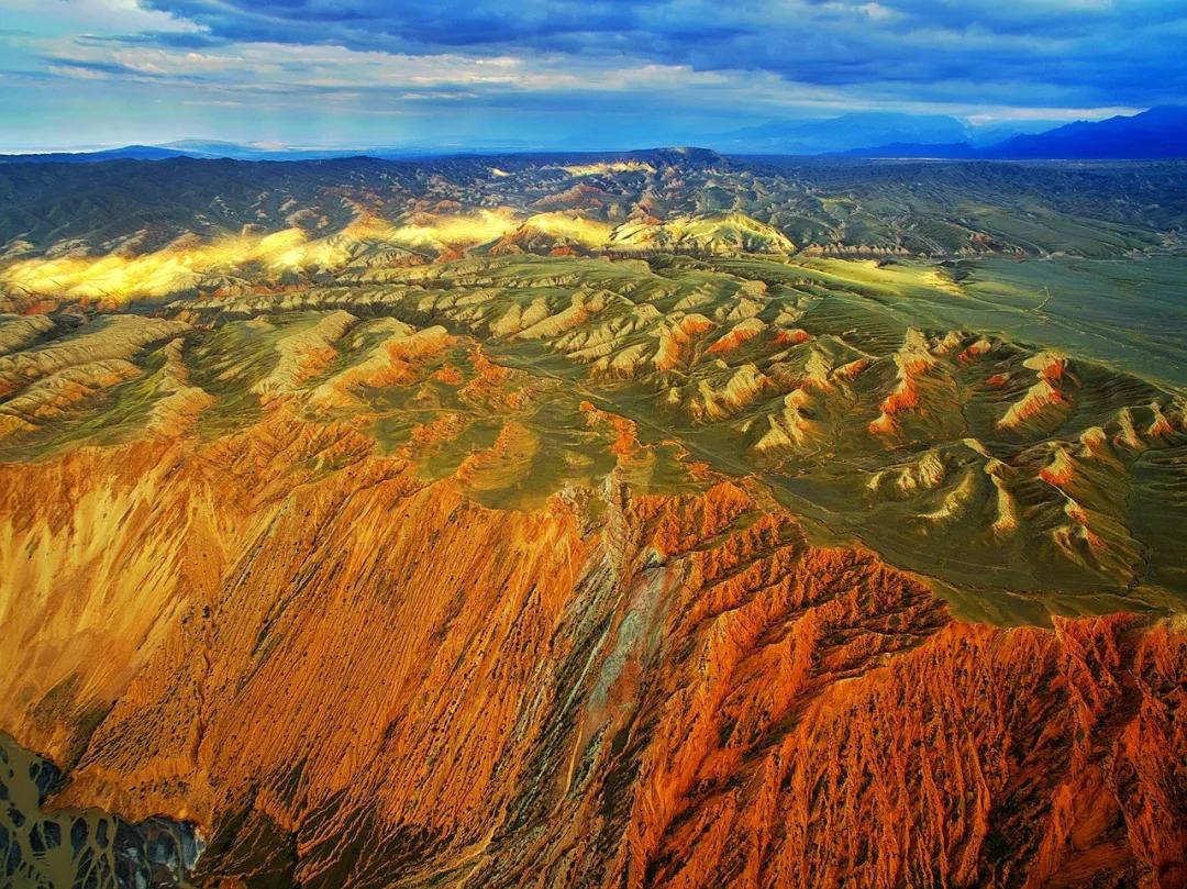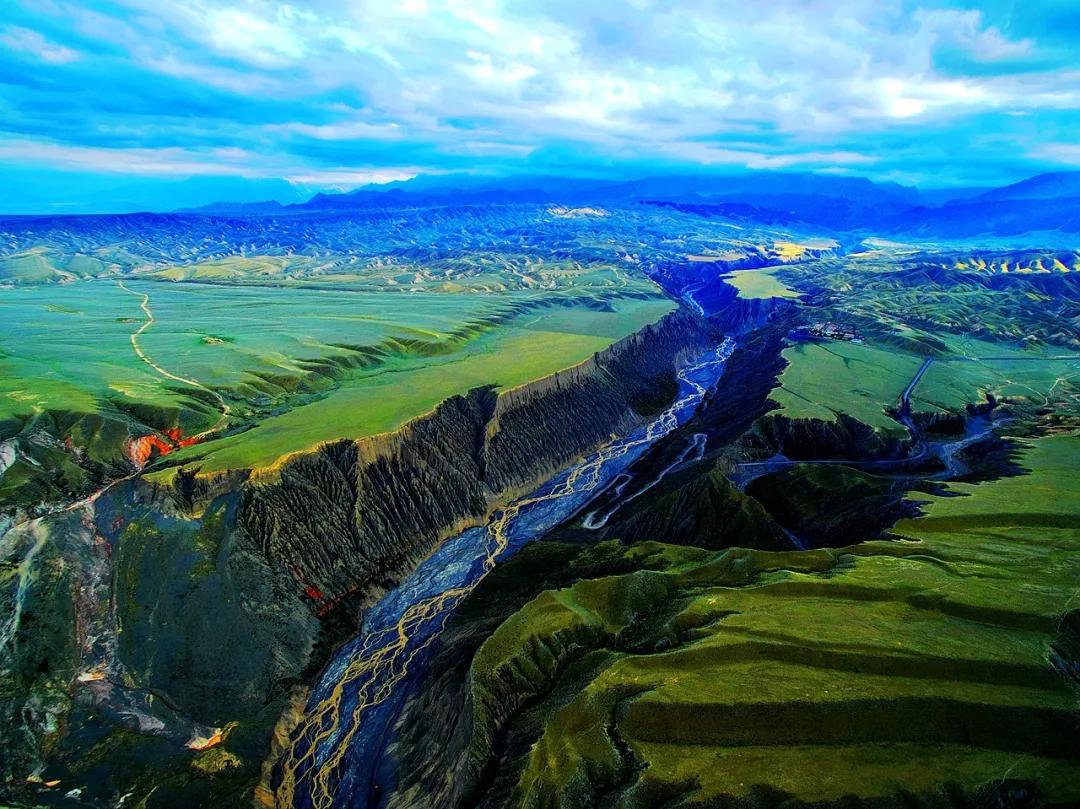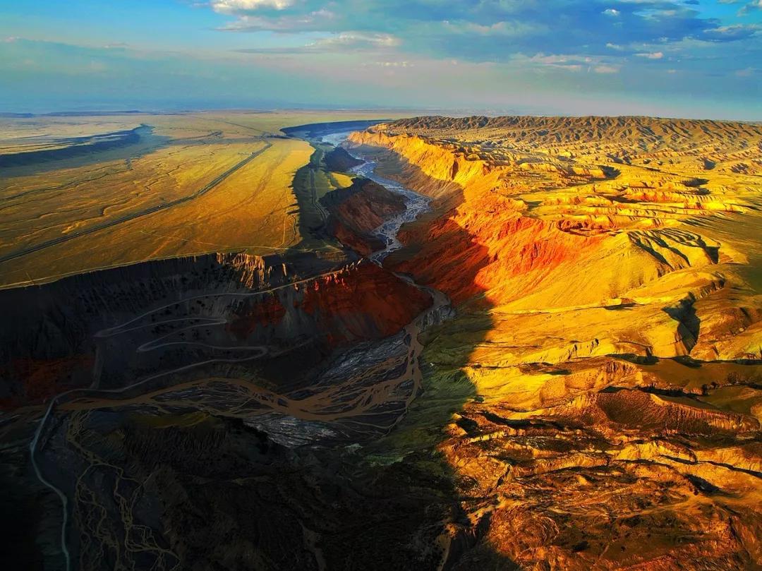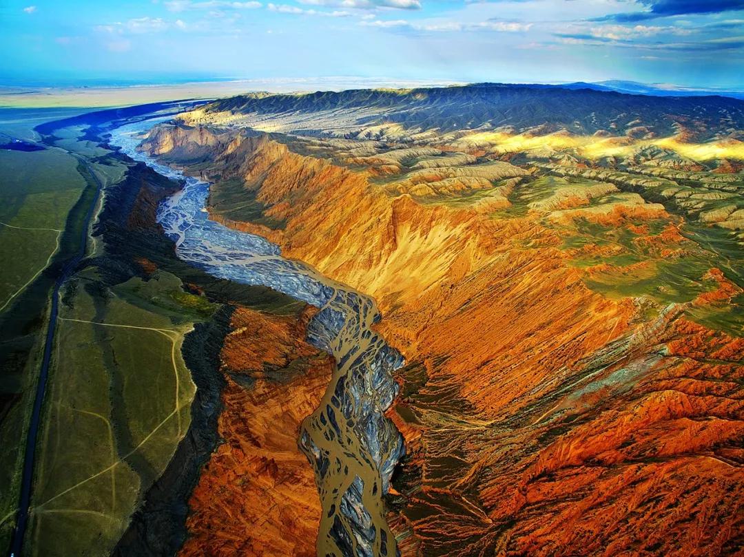 從高空看,安集海峽谷的色彩異常豐富,河流切割大地,將不同顏色的巖層沖刷溶解,形成了一幅絢麗多彩的大地抽象畫景觀。與其他一些色彩灰冷單調(diào)的峽谷相比,擁有紅山、黛崖、青峰、綠島、碧水等豐富色彩的安集海峽谷,就像一條彩帶飛舞在天山北坡腳下,成為中國(guó)峽谷群中一條色彩最豐富的大峽谷。