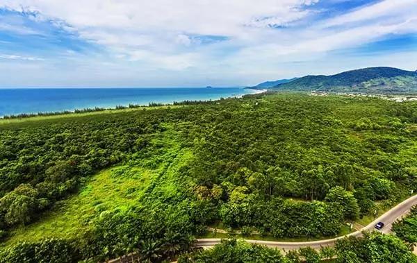 灣內(nèi)植被繁茂,有大片椰林、橡膠等熱帶作物,椰樹(shù)檳榔,相映成趣。白沙碧海,藍(lán)天流云,自成畫(huà)卷,更有青梅翠帶,溪流湖泊,秀嶼奇石,細(xì)浪柔沙,美不勝收。