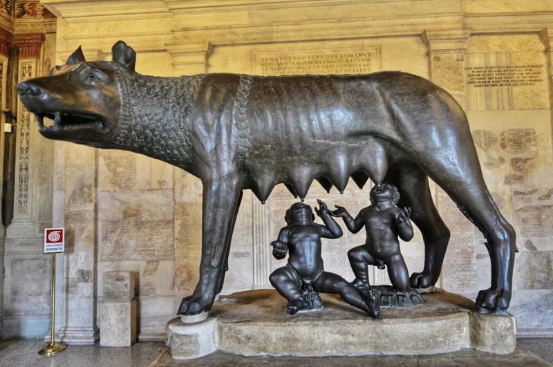 傳說公元前8世紀,古希臘君主兩個襁褓中的兒子,在權(quán)位爭斗中被人投入臺伯河,順流漂到這座7丘之地,兩個嬰孩兒喝狼奶撿回小命。