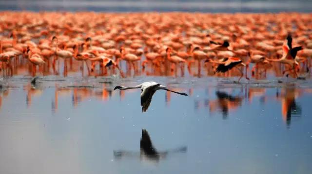 東非大裂谷猶如地球的傷痕,又好像是巨人的手筆,一連串蒸騰、冒泡的鹽堿湖沿著裂谷排開。別的生物都想遠(yuǎn)離腐蝕性的湖水,但火烈鳥卻不怕,成千上萬只迅速將大地和湖泊染成了粉色。近距離觀察,這些粉色的家伙確實(shí)不算漂亮。不過,待到它們展開雙翅,從頭到腳都是紅與黑的變換,在青山綠水中立刻成為人們眼中的焦點(diǎn)。不過,近年來火烈鳥已經(jīng)從納庫魯湖搬到了博戈里亞湖,想看 “紅云”的話,記得調(diào)整好你的行程。