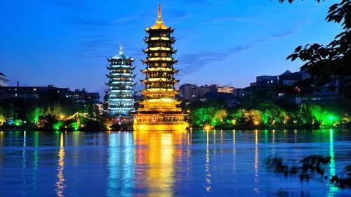 游覽新地標(biāo)【日月雙塔】(登塔約40分鐘),座落在桂林城的中軸線上,與象山上的普賢塔、塔山上的壽佛塔,相互呼應(yīng),相互映襯,有“四塔同美”之說,是兩江四湖環(huán)城水系中最著名的旅游景點;