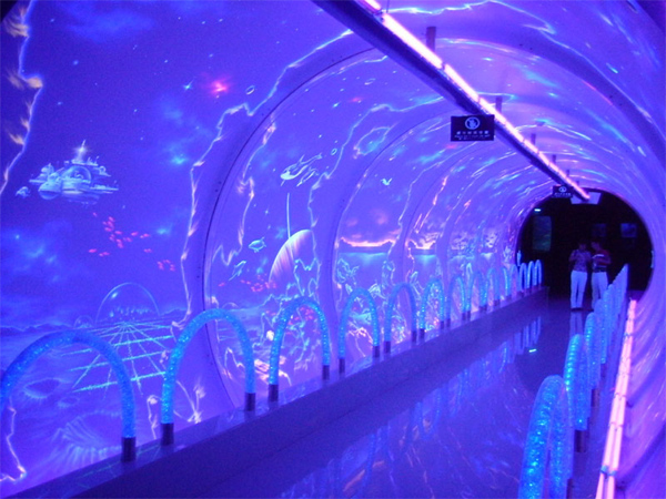 國(guó)內(nèi)絕無(wú)僅有的熒光純手工壁畫,由日本著名熒光畫大師遠(yuǎn)山先生花了3個(gè)多月畫成,價(jià)值超三百萬(wàn)元。整個(gè)壁畫描述了海洋形成、發(fā)展過(guò)程和未來(lái)的遐想,即海洋的昨天、今天和未來(lái),在這里你可以完全放飛你的想象;該壁畫另一奇妙之處:如果關(guān)閉熒光燈,壁畫會(huì)變成一面白墻,什么也不見(jiàn),但是打開(kāi)熒光燈后,畫面栩栩如生,層次分明,你不得不驚嘆大師的高超技藝。