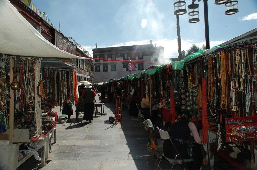 直到解放前,八角街的外圍還算比較寬敞,貴族們的官邸都建在八角街的外圍。但那時(shí),八角街卻早已是包羅萬(wàn)象、無(wú)所不有的拉薩社會(huì)生活的縮影了。從街面上看,這里到處是高聳的一幢挨一幢的藏式樓房,這些樓房中有的是白墻紅頂,顯得氣派宏大;有的披滿灰塵,墻體歪斜,顯得簡(jiǎn)陋。那時(shí),八角街里既有噶廈政府、地方法庭、監(jiān)獄等機(jī)構(gòu),又有商店、攤點(diǎn)、手工作坊。這里住著貴族、僧人、學(xué)者,也住著木匠、銀匠、鐵匠、畫匠、裁縫等手藝人和平民。這些人在無(wú)數(shù)的小貨攤、小帳篷底下,或在一間挨一間的向里伸展進(jìn)去的小店中,進(jìn)行著各式各樣、豐富多彩的交易。在八角街的手工作坊里,人們還生產(chǎn)出氌氆、地毯、藏被等生活用品。這里是西藏商品、物資的集散地,也是西藏民族文化的“百科全書”。八角街轉(zhuǎn)經(jīng)道編輯八角街轉(zhuǎn)經(jīng)道是藏族群眾心中最重要的一條轉(zhuǎn)經(jīng)道,藏語(yǔ)意為“中圈”,是相對(duì)于“林廓”和大昭寺內(nèi)的“囊廓”而言。傍晚轉(zhuǎn)經(jīng)的特定時(shí)間一到,那些互不相識(shí)的人們-有來(lái)自藏北牧區(qū)穿白袍的,有來(lái)自康巴山地盤英雄結(jié)的,還有住在八角街區(qū)、衣著亮麗的……總之,各式各樣的信徒,象是突然接到了一項(xiàng)無(wú)聲的命令,在使人猛然感到一陣騷動(dòng)之后,便開(kāi)始嚴(yán)格地按順時(shí)針?lè)较蜓刂@條環(huán)形路走下去。八角街內(nèi)的古跡編輯圍繞著八角街的轉(zhuǎn)經(jīng)路有許多古跡。在環(huán)形路與公路交叉的道口上,曾經(jīng)豎立著一個(gè)高高的名叫“覺(jué)牙達(dá)金”大法輪柱。藏族姑娘年滿十六歲,就要到覺(jué)牙達(dá)金大桅桿前舉行一個(gè)慶賀成年的儀式。沿著轉(zhuǎn)經(jīng)路走,在八角北街24號(hào)院子里,有一幢看起來(lái)很普通的兩層高的小樓名字叫“曲結(jié)頗章”,就是赫赫有名的“法王宮”,是四大宮殿中的第一座,也是八角街的第一所房子。它是在修建大昭寺之前,松贊干布為自己建造的一個(gè)簡(jiǎn)樸的行宮。從八角北街24號(hào)出來(lái),繼續(xù)前行,人們會(huì)在白色的香塔前發(fā)現(xiàn)一處開(kāi)闊的小廣場(chǎng)。那小白塔過(guò)去是專門為財(cái)神爺燒香的,它保佑著在香塔四周做買賣的生意人。