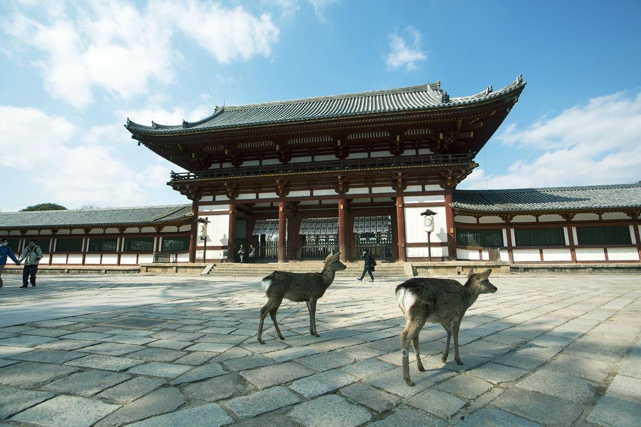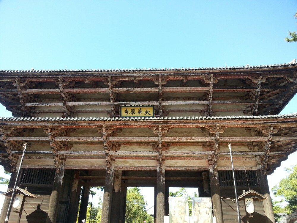 被稱為世界遺產(chǎn)的東大寺正門——南大門,寬約50米、高約25米。于760年建成但因為火災(zāi)燒毀了,于鐮倉時期被修復(fù)重建。南大門設(shè)有高大威猛的金剛力士像(哞形像)。