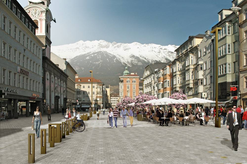 因斯布魯克建立于1239年。這座美麗的小城坐落在阿爾卑斯山谷之中,旁邊流淌著因河。 奧地利的高山,就跟她的音樂一樣,是世界知名的。蒂洛爾州則是阿爾卑斯山的心臟。無論是在因斯布魯克的哪一個角落,都能見到白雪覆蓋的山巒。因為北面被山脈遮擋,所以因斯布魯克氣候宜人,是國際旅游的勝地。