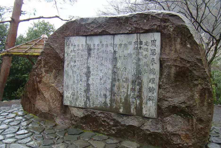 1917年9月,周恩來東渡日本留學(xué)。1919年4月在回國途中,他游覽了京都,并撰寫白話詩四首。1979年1月22日,由京都各日中友好團(tuán)體和知名人士聯(lián)合倡議,成立了“周恩來詩碑籌建委員會”。1979年4月16日,詩碑建成。