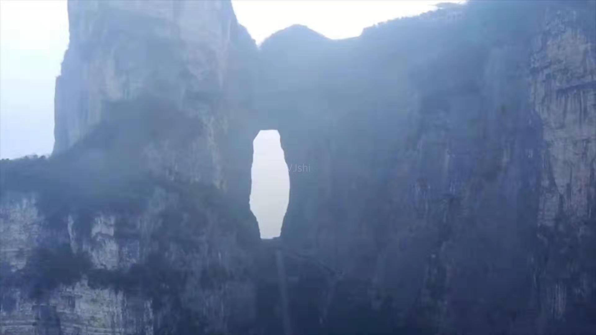 空曠而明朗,洞門前后的山峰,都很低,惟有此山獨尊。一洞空明,除悠悠白云,就是融融藍天,一塵不染。所以給1999年的飛機穿越此洞提供了絕好的條件。