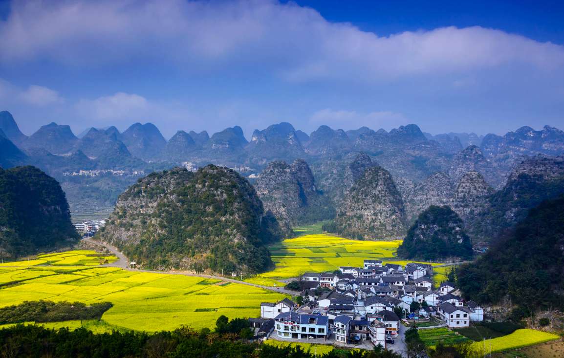 萬畝油菜花:萬畝油菜花盛開在烈烈暖陽下,在層疊的峰林間,一座座峰林在初春的日光下延伸到天邊。山下是燦爛明黃的大海般的油菜花田,不知名的村寨掩映其中若隱若現(xiàn)。遠處青山如黛,近處大片大片的油菜花開得熱烈燦爛。
