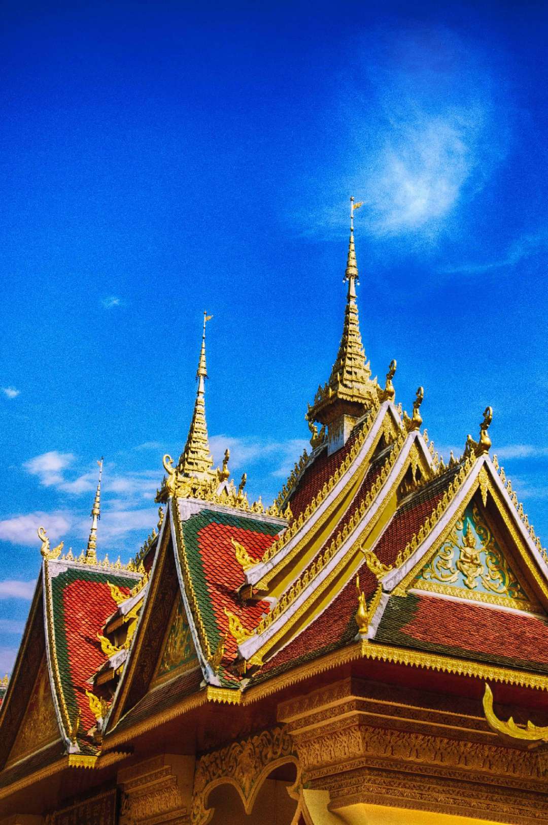 西雙版納傣族佛寺建筑,以重檐多坡面平瓦建筑為主。佛寺大多成方形,坐西朝東,屋頂坡面由三層相疊而成,中堂較高,東西兩側(cè)遞減,交錯起落。屋頂使用長方形片瓦,瓦尾鉤在平形的竹制橫椽之上。屋頂正脊及檐面之間的戧脊,用石灰抹平,上面排列各種瓦飾。正脊上的那瓦飾呈火焰狀,戧脊首端大多豎有鳳的形象,風(fēng)格獨(dú)特。各佛寺佛殿內(nèi)部由佛座、僧座和經(jīng)書臺3部分組成。佛座上塑的釋迦牟尼像,大多是坐像,佛祖的耳朵奇特,又大又寬,成“<”形。身材瘦削,眉清目秀,雙手扶膝,流露出一種神秘的氣氛,使人產(chǎn)生對傣族歷史追溯的好奇心。