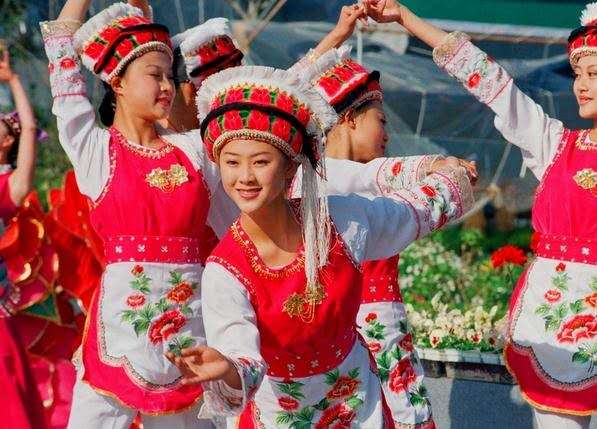 女子腰身苗條、婀娜,衣著色彩鮮艷、明快又大方。尤其是她們的繡花包頭,體現(xiàn)了大理的“風花雪月” 四景。看,彎彎的包頭像洱海里的新月;艷麗的朵朵繡花代表了上關(guān)花;頂端潔白的纓須像蒼山頂?shù)陌籽欢H垂下的纓穗隨風飄灑,顯示了下關(guān)的風。