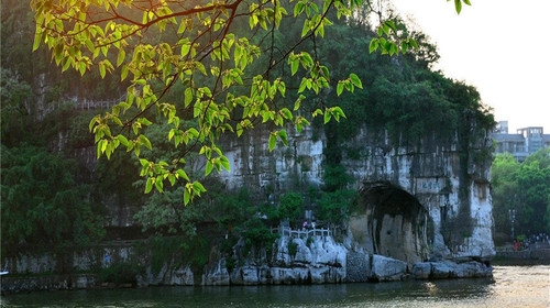 象鼻山,簡(jiǎn)稱“象山”,位于漓江與桃花江(舊稱陽(yáng)江)匯流處,因其山形酷似一只站在漓江邊伸長(zhǎng)鼻子飽飲江水的大象而得名。象鼻山因在漓江之濱,原名“漓山”。唐會(huì)昌年間(841—846年),唐代詩(shī)人、桂管觀察使元晦以“漓山”之名與陜西臨潼的“驪山”音同,為避其誤會(huì),又取風(fēng)景宜人之意,更名“宜山”。后又將“宜山”寫作“儀山”,因古文“宜”與“儀”通,音也一樣。唐代莫休符在《桂林風(fēng)土記》中說(shuō),漓山“一名沉水山,以其在水中,遂名之。”沉水山之名在歷史上文人士大夫之中很少見(jiàn),估計(jì)是民間的俗稱。明朝孔鏞也曾在廣東、山西、貴州等地任職。他有一首著名的《象鼻山》詩(shī),對(duì)象鼻山作了生動(dòng)的描繪: