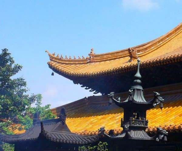 天王殿。亦稱金剛殿,面寬五間,進(jìn)深四間,重檐歇山。進(jìn)門迎面是一彌勒菩薩,光首、笑臉、袒胸、盤坐,一手拿一只布袋。據(jù)說他能將世人一切苦難裝入布袋之中。佛像兩旁有一副對聯(lián):“慈顏含笑笑天下之可笑之人,大腹可容容世間難容之事”,以勸人們慈悲大度為懷,用樂觀態(tài)度對待風(fēng)雨變幻的生活。彌勒菩薩后面的塑像是韋馱菩薩,昂然挺立,手持寶杵,據(jù)傳韋馱是神將之首,常于東、南、西三州巡游,守護(hù)伽藍(lán),屬護(hù)法神。兩旁的四大天王宛如四名衛(wèi)士在維護(hù)法門,他們是東、南、西、北四個方面的天王,各自手里拿著法器。殿后有香樟8株,直徑0.8-2米多,植茂蓋庭。