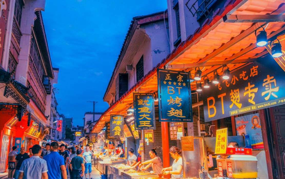 滿為患,連店門口也會擺滿桌椅。烤肉串、涮牛肚的煙火在不甚明亮的燈光下彌漫整條街,熙熙攘攘的人群都是邊逛、邊吃,看到小攤上中意的東西就和攤主還還價。還可以到鼓樓廣場的座椅上歇歇腳,看賣風(fēng)箏的小販把數(shù)十米長的風(fēng)箏一直放到馬路對面的高樓頂上,一切都充滿真實熱鬧的生活熱情。