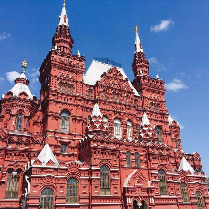 克里姆林宮整體呈不等邊三角形。面積27.5萬平方米,周長2公里多,始建于1156年。1935年在斯巴斯克塔、尼古拉塔、特羅伊茨克塔、鮑羅維茨塔和沃多夫塔等塔樓各裝有大小不一的五角星,以紅水晶石和金屬框鑲制而成,內(nèi)置5000瓦功率照明燈,紅光閃閃,晝夜遙遙可見。