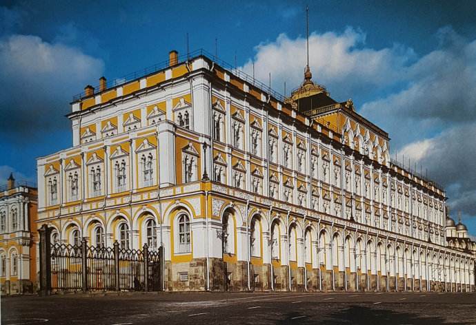 1838年,大克里姆林宮重建,全部由俄羅斯工匠采用本國建筑材料建成,外表看是三層建筑,實際是兩層,第一層向前突出,構(gòu)成一個露天陽臺,后來作為蘇聯(lián)政府、蘇共中央和社會團體舉行會議的場所。