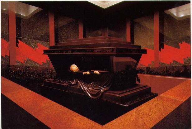 沿黑色大理石臺(tái)階而下,轉(zhuǎn)彎即進(jìn)入陵墓中心――悼念大廳。大廳四周環(huán)鑲紅磚,墻壁上有用花崗石雕刻的蘇聯(lián)國(guó)徽和國(guó)旗。