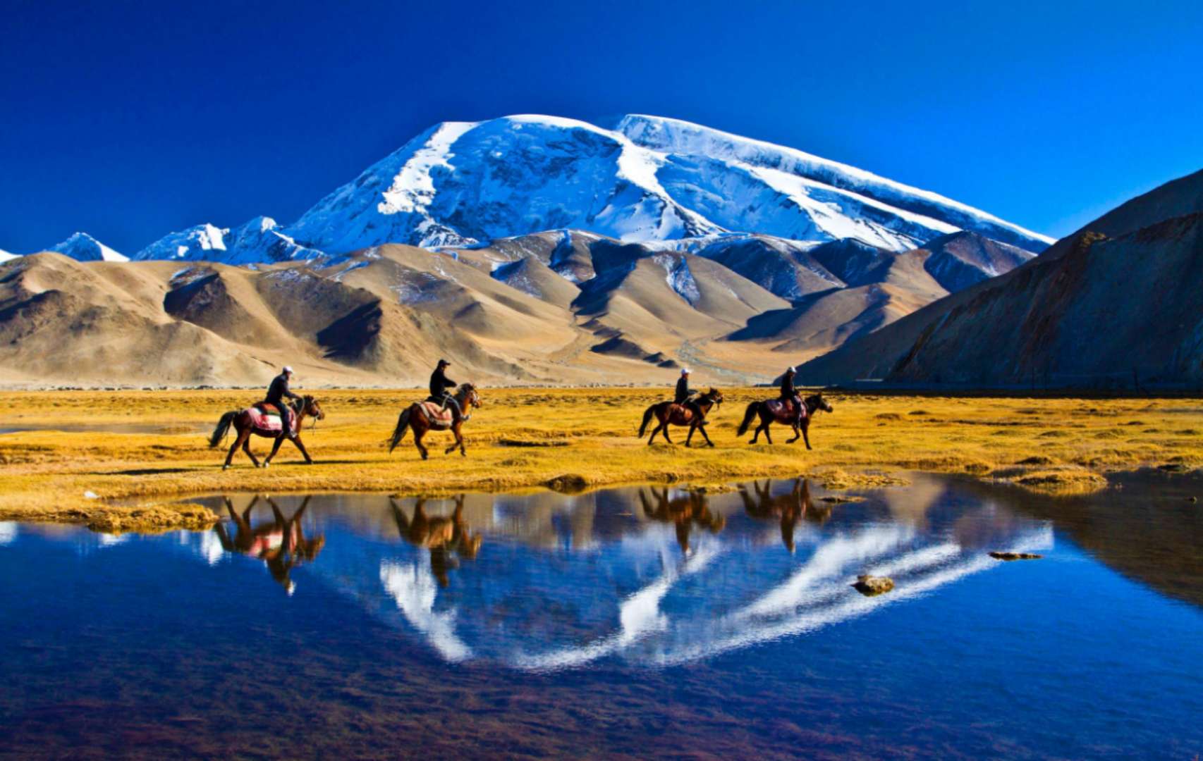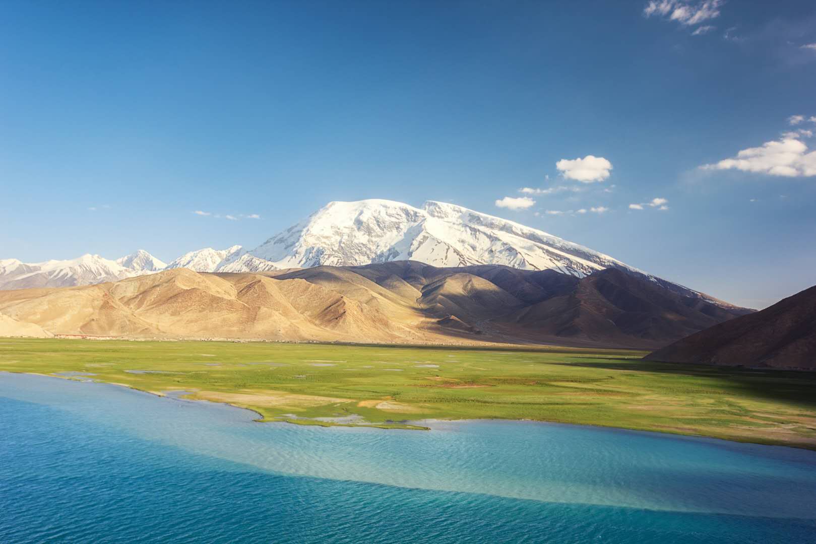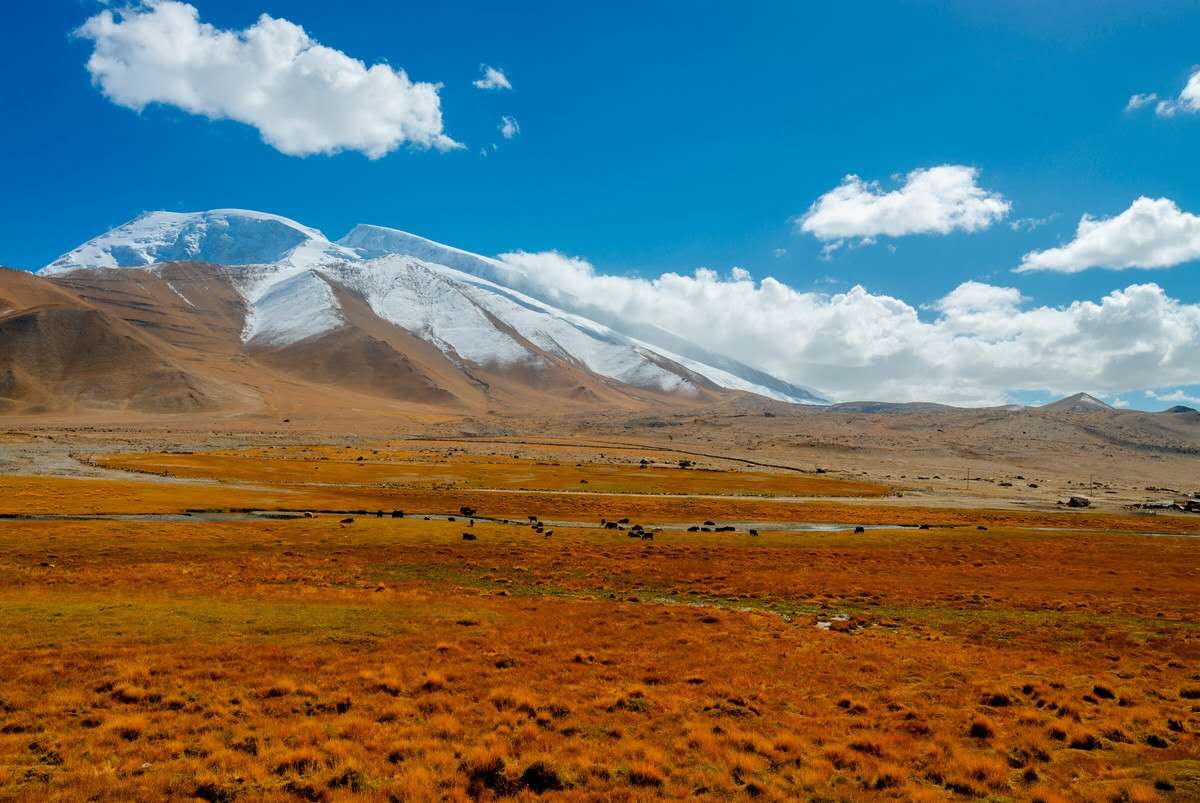 慕士塔格峰、公格爾峰及公格爾九別峰,三山聳立,如同擎天玉柱,屹立在帕米爾高原上,是帕米爾高原上最迷人的景觀。