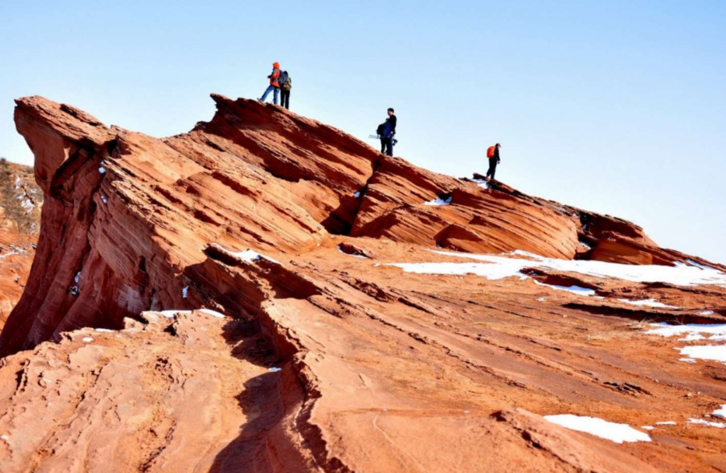 現(xiàn)在懸崖上可以看到的粗細(xì)相間的沉積層理,顆粒粗大(直徑在2mm以上的碎屑的含量大于50%)的巖層叫“礫巖”,細(xì)密均勻(直徑在2—0.05mm的碎屑含量大于50%)的巖層叫做“砂巖”。丹霞地貌最突出的特點是“赤壁丹崖”廣泛發(fā)育,形成了頂平、身陡、麓緩的方山、石墻、石峰、石柱等奇險的地貌形態(tài),各異的山石形成一種觀賞價值很高的風(fēng)景地貌,是名副其實的“紅石公園”。