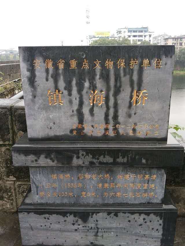 鎮(zhèn)海橋又名老大橋,為明嘉靖十五年(1536年)始建,清康熙十五年(1676年)重修,清康熙三十四年(1695年)再遭水毀,清康熙三十八年(1699年)再度重修,是連接屯溪老街和黎陽(yáng)古鎮(zhèn)的交通樞紐。