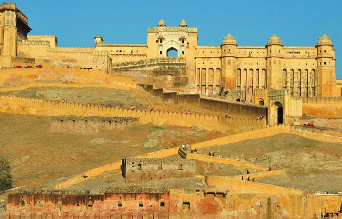 坐落在齋普爾的琥珀山山坡上的一座土黃色城堡,含比較濃厚的伊斯蘭教建筑風格,歷史上印度曾長期定都于此,古堡依山傍河而建,由眾多獨立宮殿組成,其中有著名的Sheesh Mahal(鏡宮)和Jaigarh(杰加爾堡)。