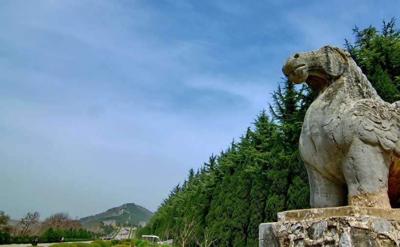 從梁山南二峰的天然雙闕起,往北依次對稱排列。端立首位的是1對高達(dá)8米有余的八棱柱石華表,這是帝王陵墓的標(biāo)志,其造型昭示著生命長存的理念和古代先民對人類生殖行為的崇拜。接著是一對昂首挺胸、渾圓壯觀的石刻翼馬,馬身兩翼雕以卷云紋,似有騰飛之勢。翼馬之北是1對優(yōu)美的高浮雕鴕鳥,是唐王朝同西域人民文化交流與友好往來的象征。緊接鴕鳥的是5對配有馭手的石仗馬和10對高4米左右的石翁仲(或稱直閣將軍)。