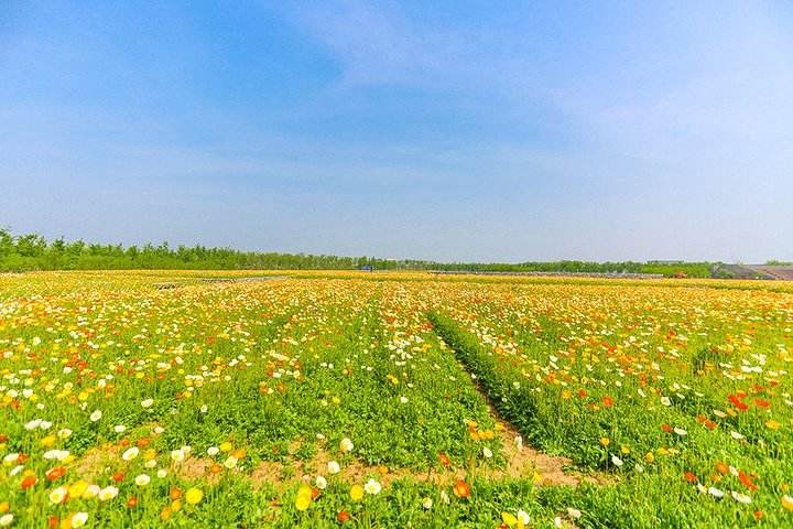 公園內(nèi)的“衲田花海”,總面積2220畝,由612塊花田 “縫補”拼接而成,融合了北方旱梯田的雄渾和南方水梯田的俊秀,與僧人袈裟異曲同工,又兼具納祥聚福之意,樸質(zhì)卻熠熠生輝。這里栽植著50多種花卉,自南向北形成黃、紅、紫三大色區(qū),呈現(xiàn)出海納百川之態(tài)、兼容并蓄之美。站在全長2.3公里的彩虹橋俯瞰花海,聽花開花落,嗅濃郁芬芳,感受濃濃的原鄉(xiāng)情懷。