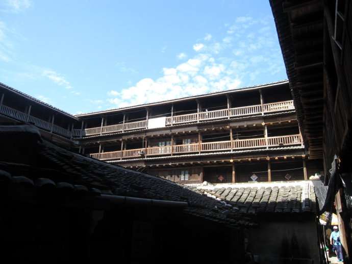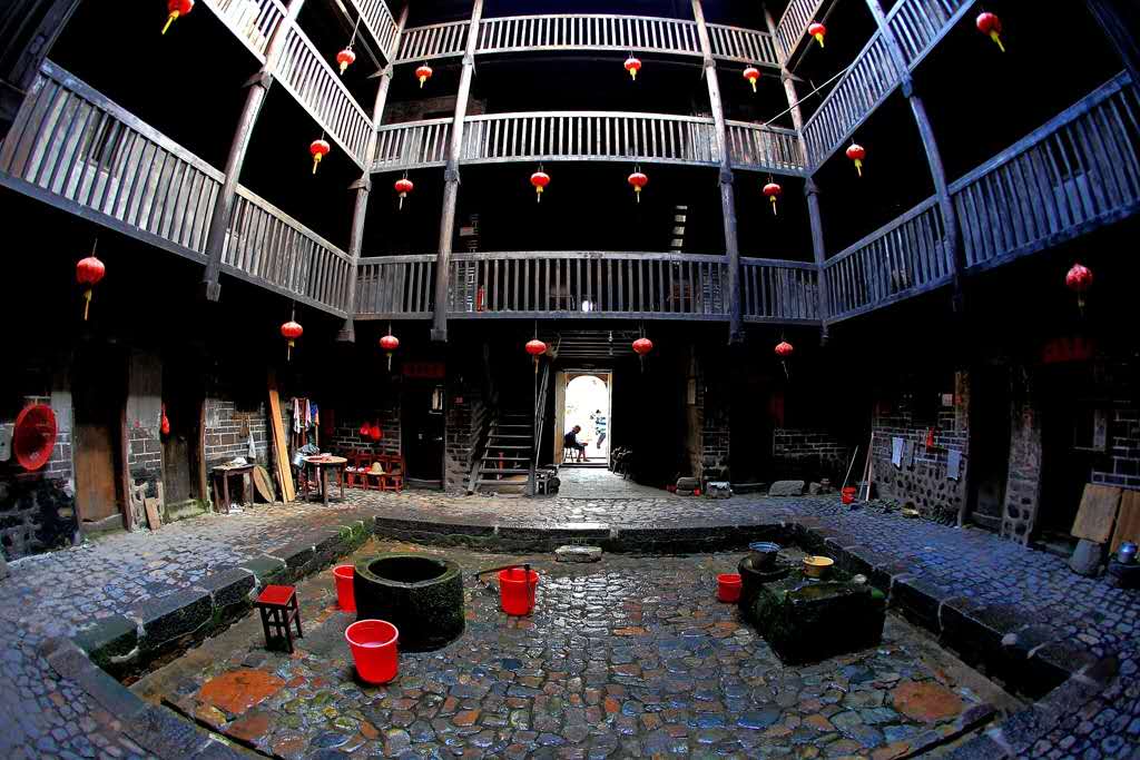 亦有五鳳型,橢圓型,八卦型,永定最多,將近二萬多座。南靖亦有一萬五千多座。永定以客家人為主,南靖為閩南人.土樓內(nèi)有水井和排水,門大多只有一個(gè),多的有3個(gè)。房間的窗戶較小。遠(yuǎn)處看去就是一個(gè)堡壘。門比較結(jié)實(shí),大多包了鐵皮,晚上大門一關(guān),非常安全。土樓的中間是祠堂,祠堂有的是獨(dú)立的。