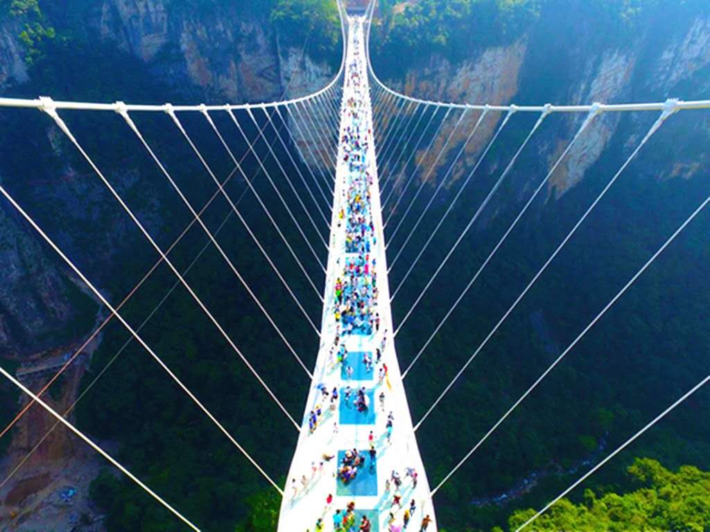 云天渡所處地形懸崖溝谷、崗巒起伏、陡峭險峻,場地屬于原始巖溶地貌,地質(zhì)條件復(fù)雜。因地處喀斯特地貌區(qū)域,建設(shè)者們在前期巖體第三次施工鉆探中發(fā)現(xiàn)玻璃橋一端主塔下方80米深處有溶洞,會嚴(yán)重威脅橋梁安全;玻璃橋最終延伸60米,橋面拓寬2.8米,以增強(qiáng)橋的安全系數(shù)。版權(quán)所有山東聊城聊之旅國際旅行社有限公司,轉(zhuǎn)載必究!橋梁設(shè)計和施建方面,克服建筑選材、玻璃工藝、抗風(fēng)防滑、抗震減振、抗壓抗凍等多項(xiàng)技術(shù)難題, 玻璃采用高強(qiáng)度航天復(fù)合材料, 具有大尺寸、高硬度、高厚度、耐磨、防凍、超純凈、防爆、高荷載、防霉、防溫度劇降、脆性玻璃與柔性橋結(jié)合等諸多特性。
