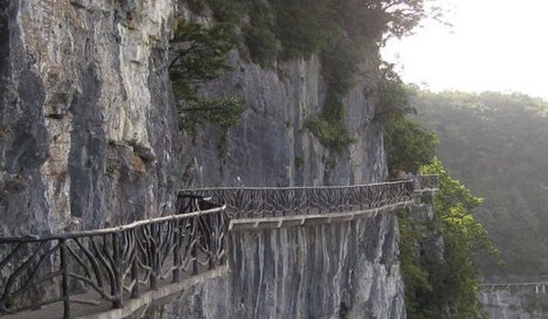 據(jù)施工人員介紹,此條棧道也是他們所修棧道中施工最難,最險峻的一條。如果您還覺得不夠刺激的話,在棧道的完結(jié)處的兩個懸崖之間有一條長160米的懸索吊橋,同時,在海拔最高點還有一個挑戰(zhàn)心里極限的玻璃站臺,在這里,如果你能挺直腰板伸開雙臂,那么,您就是真正的勇士了。
